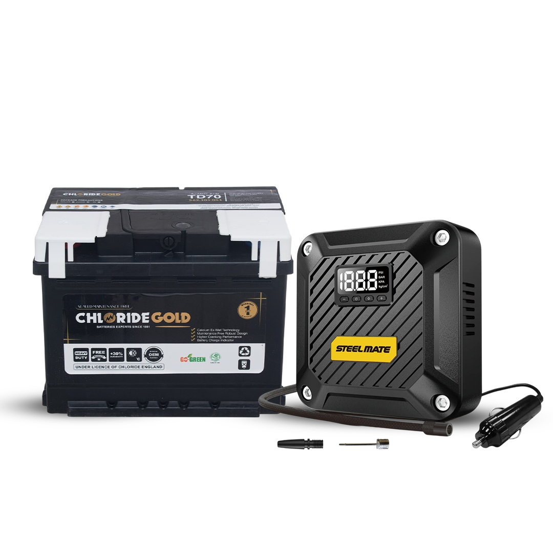 - Chloride Gold Car Battery - TD70L 12/62 AH R & SteelMate T5 Digital Air Compressor